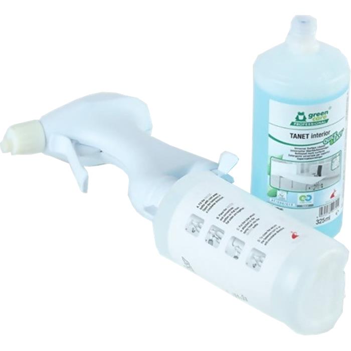 Aspecto: líquido. Color: azul. Olor: característico. pH: aprox. 7 a 20ºC. Densidad: aprox. 0,985 gr/cm3 a 20ºC. Como parte del sistema de dosificación portable Quick & Easy, el producto TANET interior Quick & Easy altamenteconcentrado combina el máximo rendimiento con un esfuerzo mínimo y un bajo coste operativo. Dado que no esta clasificado CLP, ofrece la máxima seguridad para el usuario durante la aplicación. Gracias a su exclusiva fórmula de agentes tesioactivos, este limpiador de superficies se seca rápidamente y no dejamarcas ni manchas. Este producto convence por sus excelentes resultados de limpieza y su versatilidad, dado que también se puedeutilizar para limpiar cristales, por ejemplo. La espuma limpiadora universal cuida los materiales y deja un aroma agradable. Mayoritariamente procedente de fuentes renovables, este limpiador de mantenimiento protege el bienestar de las generaciones futuras.