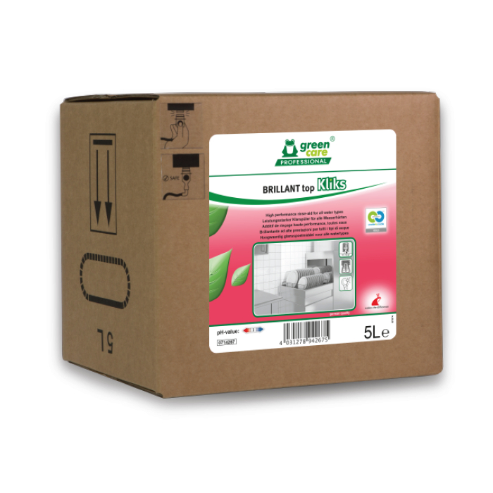 BRILLANT topKliks es adecuado para todo tipo de lavavajillas que utilizan aguas medias/duras, como los túneles de lavado o las campanas. Utilizar en combinación con los productos green care ENERGY KLIKS.