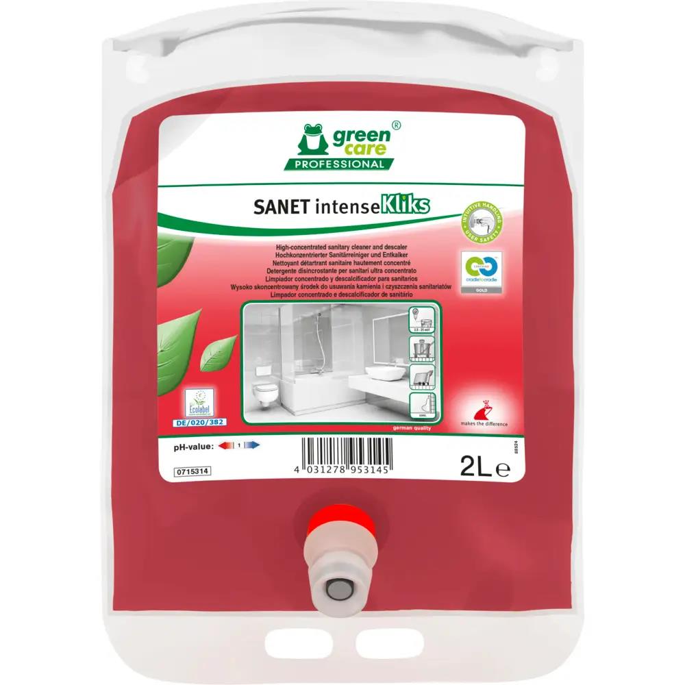 SANET intenseKLIKS es idóneo para todas las super?cies resistentes a ácidos en áreas sanitarias. No utilizar en mármol u otros materiales sensibles a ácidos. No utilizar productos concentrados en plásticos. Diseñado para usarse con un sistema de dosi?cación para una aplicación precisa y segura.