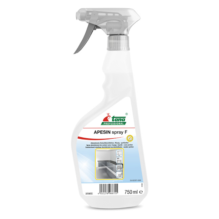 Aspecto: líquido. Incoloro. Olor: alcohólico. pH: aprox. 9. No es necesario enjuagar las superficies en contacto directo con los alimentos después de utilizar el producto. Esto ahorra tiempo. El producto se seca sin dejar residuos. APESIN Spray F está libre de cloro, aldehídos y fenoles. Número de la autorización: EU-0027671-0000. Las superficies deben estar siempre visiblemente limpias antes de la desinfección. Desinfectante de superficies listo para usar a temperatura ambiente (20±2 °C) . Ingredientes por cada 100g: 40,0 g propan-2-ol, 25,0 g propan-1-ol.