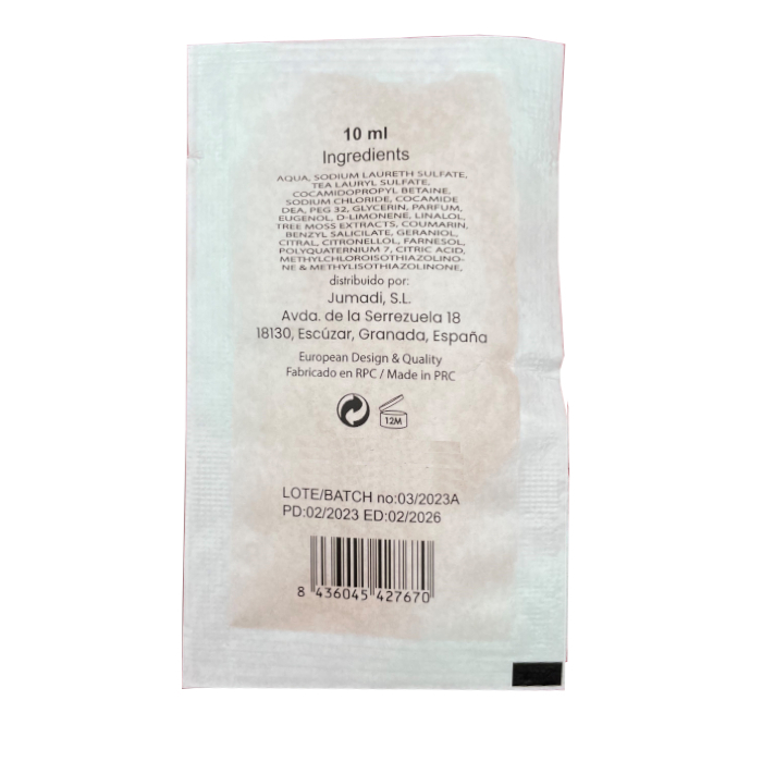 Sobre de gel de ducha de 10 ml para el cuerpo para el cuidado e higiene personal. Sin parabenos.