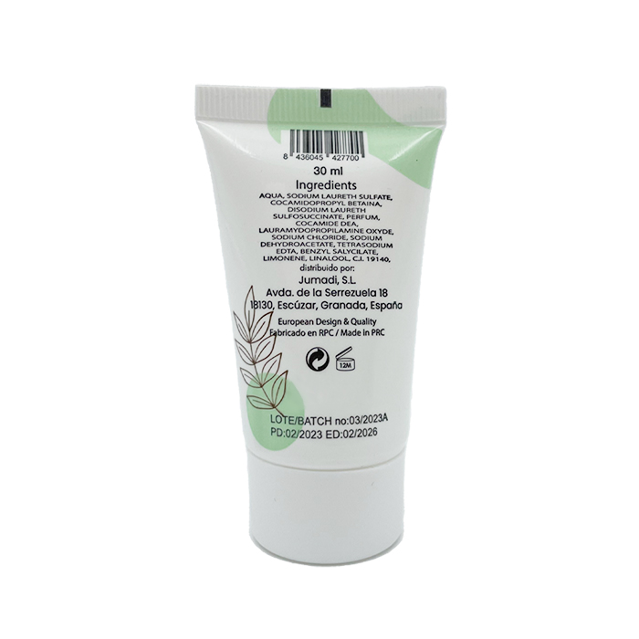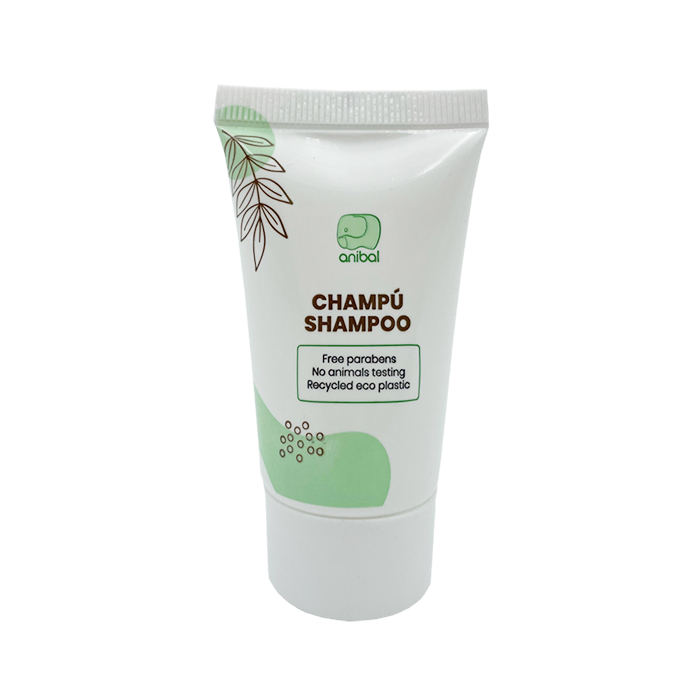 Tubo de champú de 30 ml para el cabello para el cuidado e higiene personal. Sin parabenos.