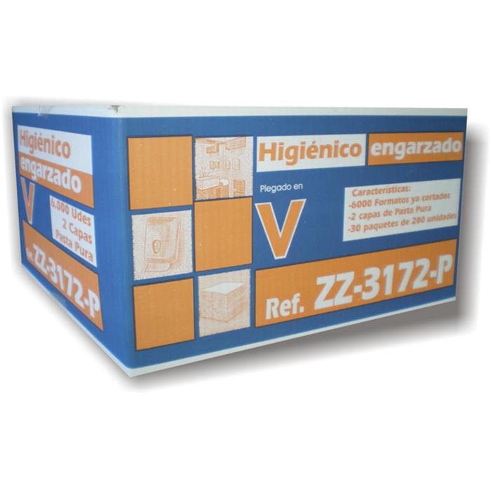 Higiénico engarzado en V pasta pura. 2 capas. Gofrado. Unión de capas en extremos. Paq. 200 unidades.