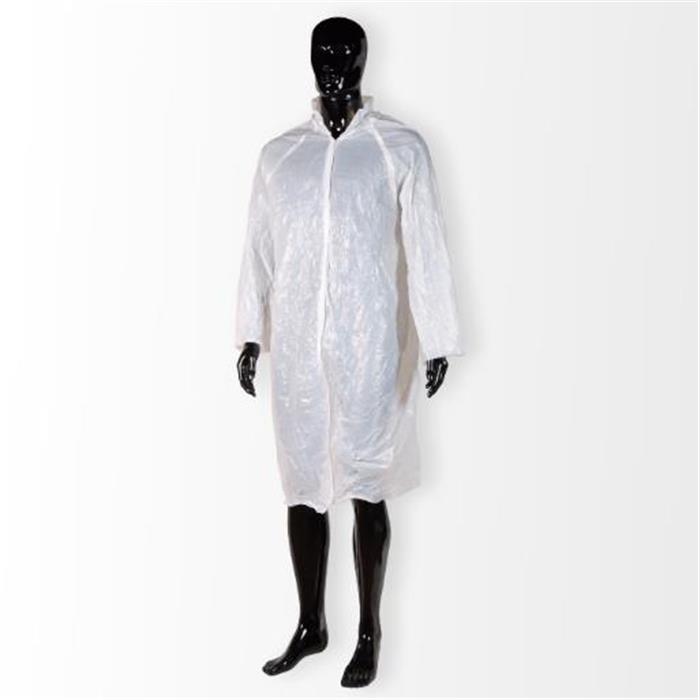 Bata blanca de visita de polietileno con cierre de corchete. Un solo uso.