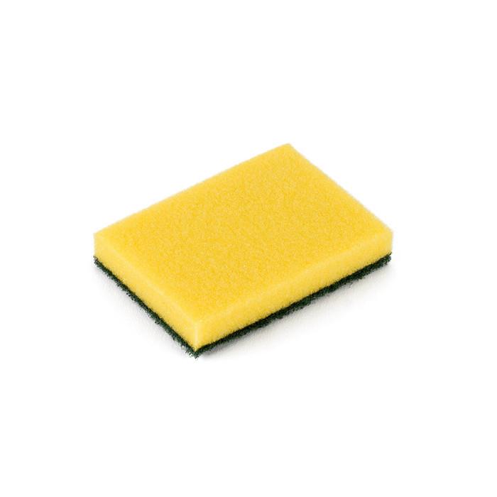 Combinación de estropajo verde para uso general, laminado sobre una esponja amarilla de poliéster.
