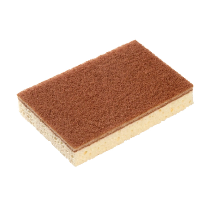 Estropajo de fibras recicladas laminadas con esponja de celulosa sin colorante de origen vegetal y 100% biodegradable.