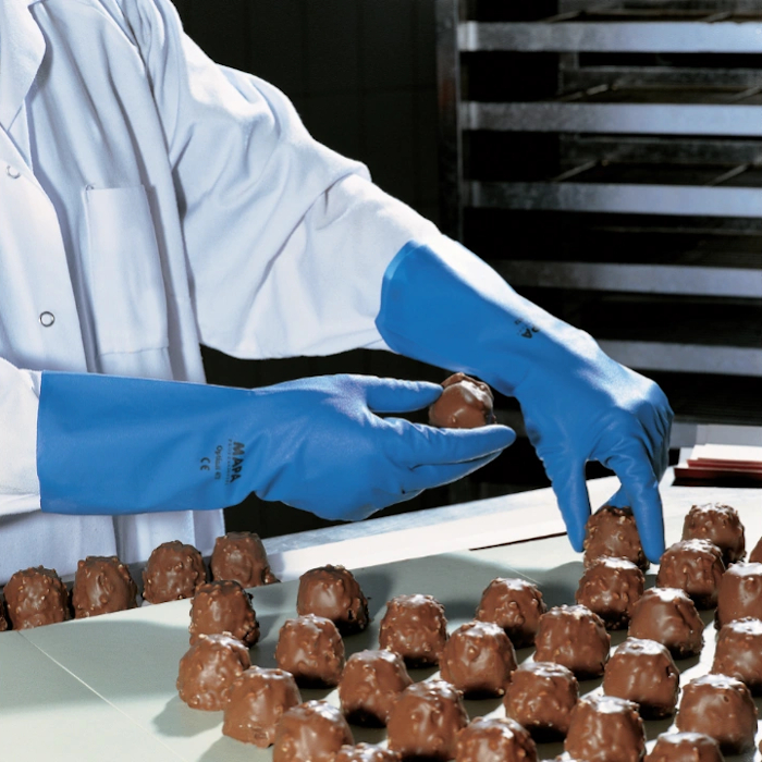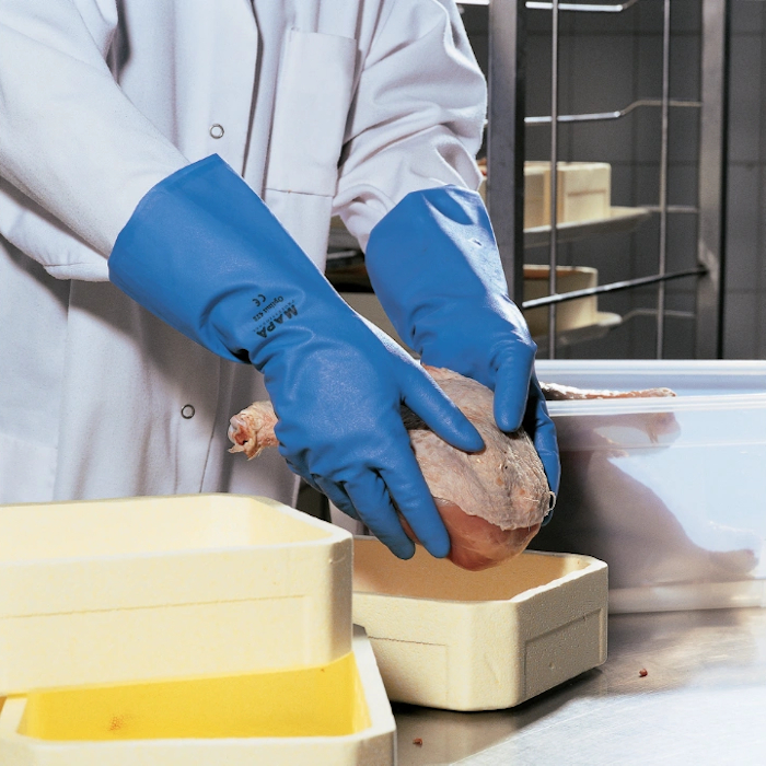 Guante nitrilo apto para el contacto con todo tipo de alimentos. Facilidad en los gestos y excelente sensibilidad, gracias a su finura.