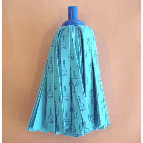 Fregona de tiras sintéticas azul. Collarín a rosca profunda adaptable a diferentes palos, con o sin rosca. Longitud tiras: 27 cm.