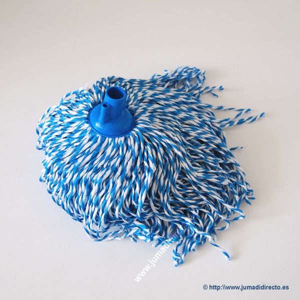 Fregona microfibra blanca y azul, 100% poliester. Longitud de las tiras de microfibra: 29 cm.