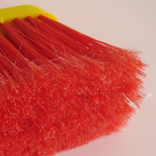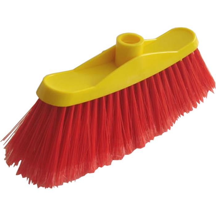 Cepillo con fibras de PVC en color rojo. Taco y rosca de polietileno amarillo.