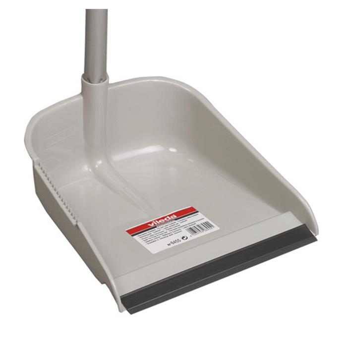 Recogedor antivuelco abierto de polipropileno. Labio de goma integrada para una óptima recogida de las partículas más pequeñas. Lateral dentado para la limpieza de las cerdas de los cepillos. Palo de acero de 80 cm pintado plástico tricapa. Peso 250.