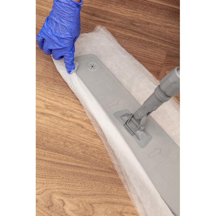 Tela sin tejer compuesta en un 100% en polipropileno con un bajo gramaje y con la impregnación homogénea por ambas caras que le proporcionan una impresionante capacidad de retener la suciedad. Se presenta en un cómodo y eficaz envase con auto cierre, que evita el secado prematuro de los mops. Elimina con una tremenda eficacia todo tipo de residuos sueltos del suelo: pelos, polvo, fibras textiles, etc.. A pesar de ser un material desechable, el 20% de su material es reciclado incluso su packaging que se ha reducido al mínimo necesario. En comparación con otros mop impregnado tradicionales.
