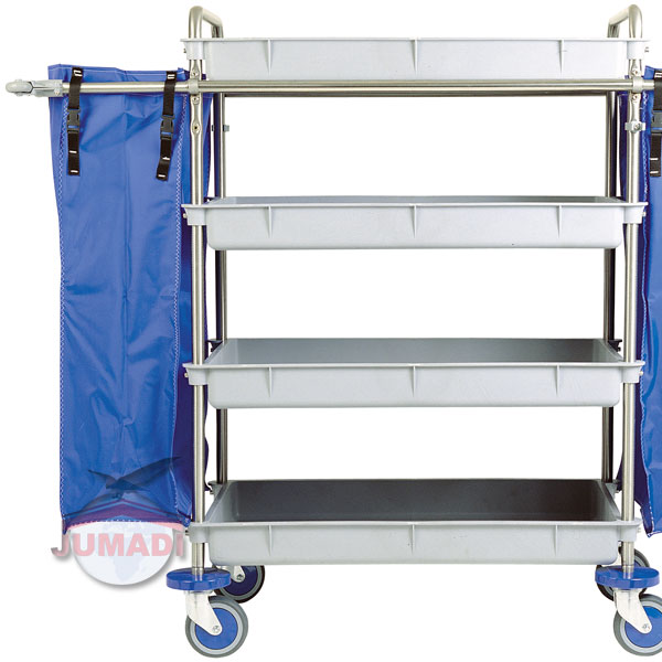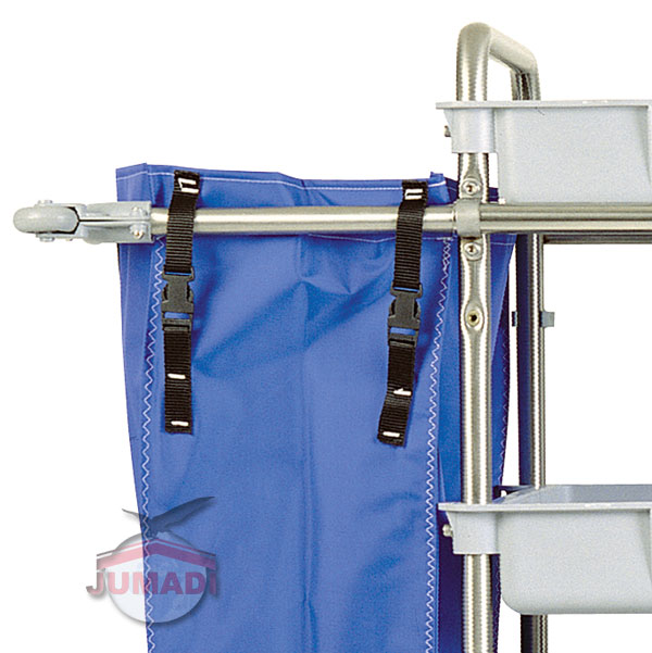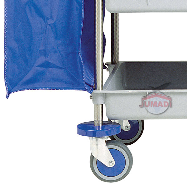 Carro cromado, 4 bandejas de polipropileno gris. 2 bolsas plastificadas, asas telescópicas, ruedas de 125 mm Ø. Capacidad bolsa: 144 l/ud.