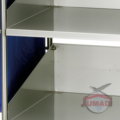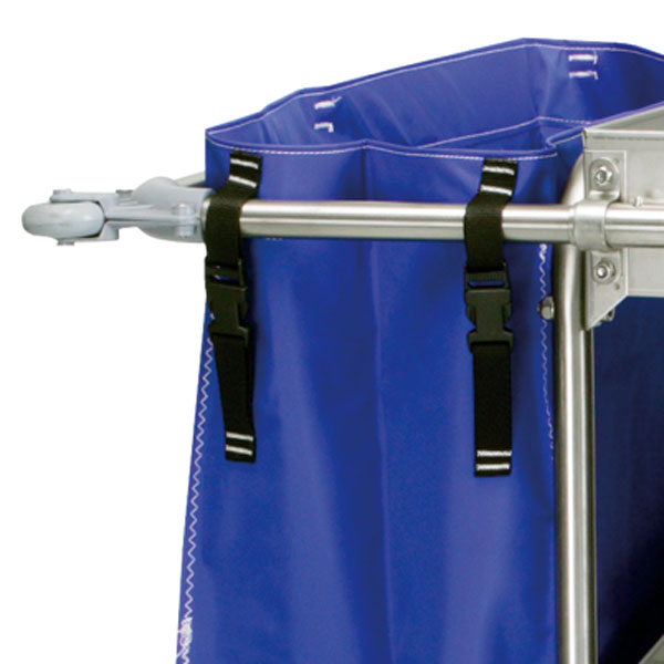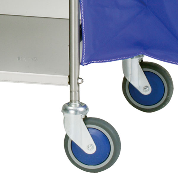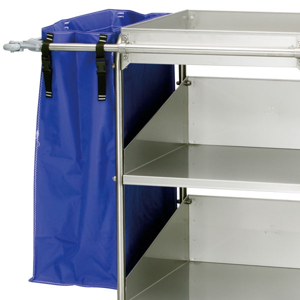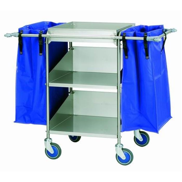 Carro Inox 18/8, de 3 bandejas Inox 18/8, con frontales abiertos, asas telescópicas, 2 bolsas de lona plastificadas azul de 77 l/ud, ruedas reforzadas de 125 mm Ø.