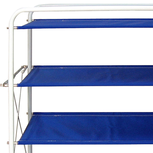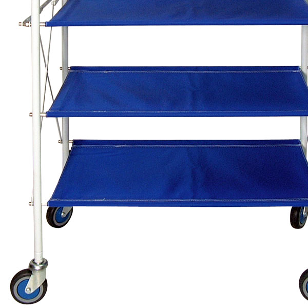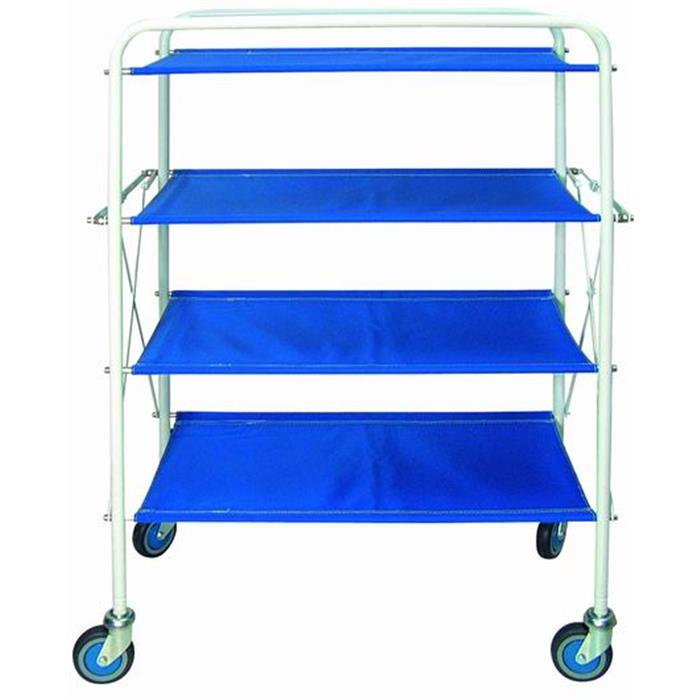 Carro plegable de hierro pintado en epoxi, color blanco, 4 bandejas de lona en color azul, ruedas de 100 mm Ø.