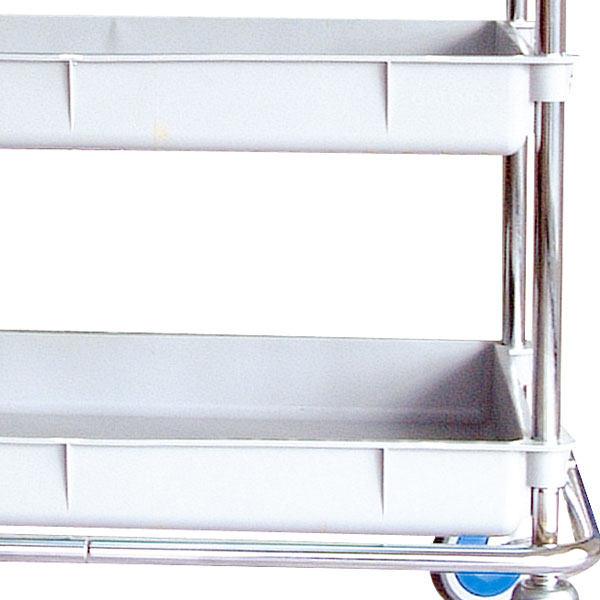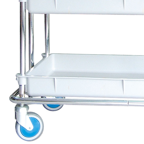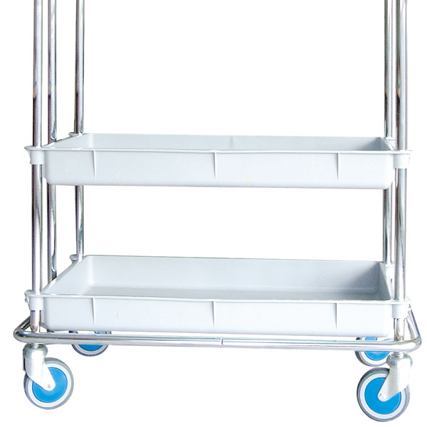Carro perchero de tubo cromado de 25 mm Ø, con soporte ropero telescópico. 1 ó 2 bandejas de poliprop. reforzado, ruedas de 125 mm Ø.