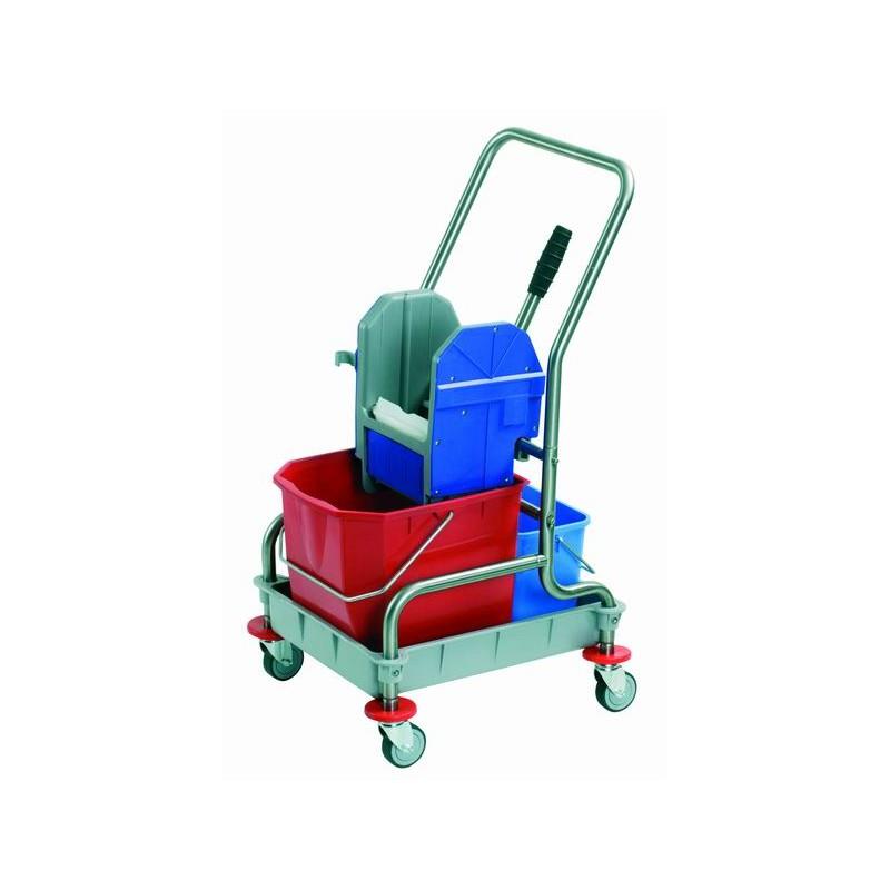 Carro fregado fácil de acero inox. 18/8 con bandeja de polipropileno. 2 cubos: 1 azul de 6 L y 1 rojo de 25 L con prensa.