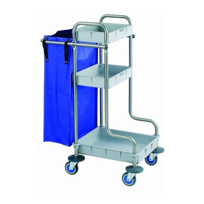 Carro fregado con 3 bandejas de polipropileno, fabricada en acero inox. 18/8. 1 bolsa plastificada de 70 L. 4 ruedas con paragolpes de 100 mm Ø