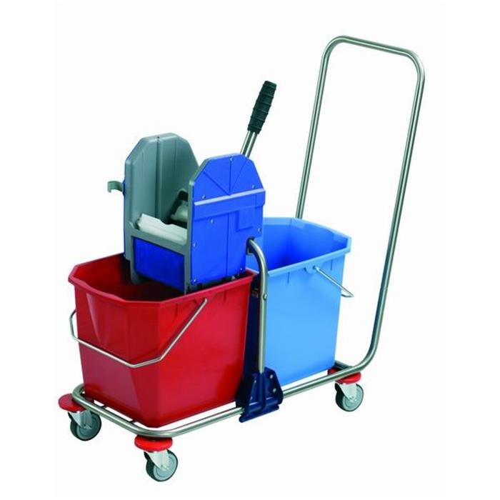 Carro fregado fácil de acero inox. 18/8. 2 cubos: 1 azul y 1 rojo de 25 L con prensa. Soporte prensa sujeto con 2 bisagras.