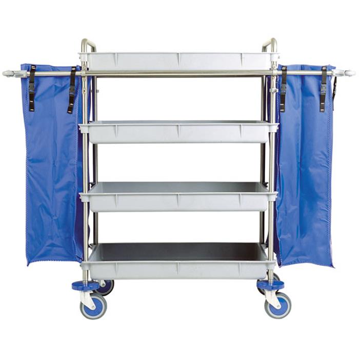 Carro Inox 18/8, 4 bandejas de polipropileno gris. 2 bolsas plastificadas, asas telescópicas, ruedas de 125 mm Ø. Capacidad bolsa: 144 l/ud.