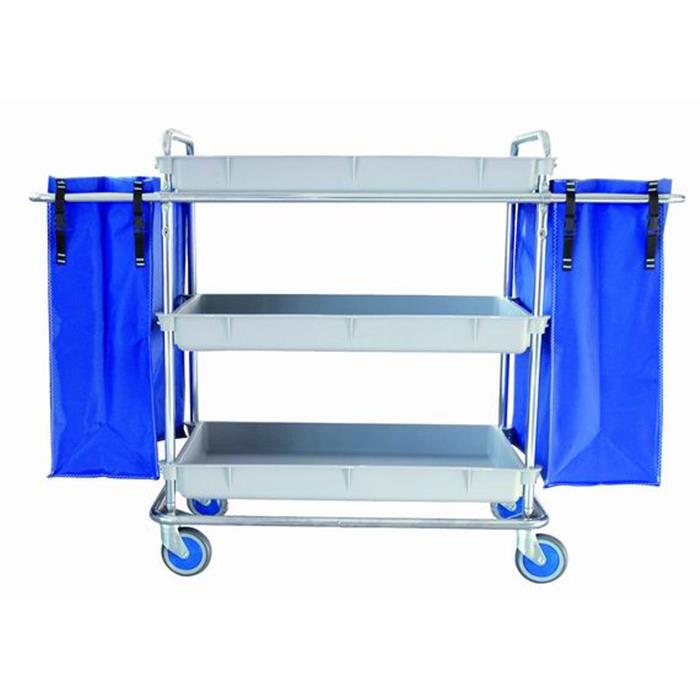 Carro cromado s/base, 3 bandejas de polipropileno gris. 2 bolsas plastificadas, asas telescópicas, ruedas de 125 mm Ø. Capacidad bolsa: 77 l/ud.