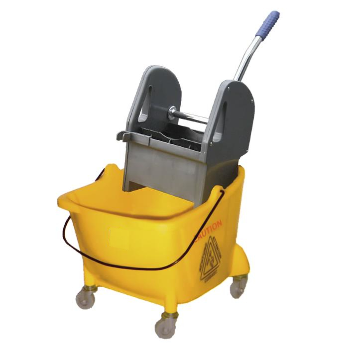 Carro con cubo amarillo de 24 L con prensa para mopas de hasta 350 g. Fabricado en polietileno de alta densidad.