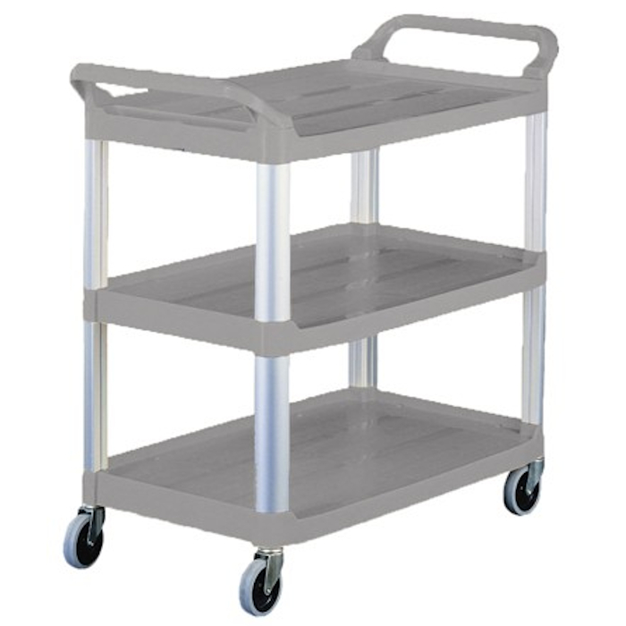 Carro de servicio gris de polipropileno y aluminio anodizado. 4 ruedas giratorias y 2 asas ergonómicas.