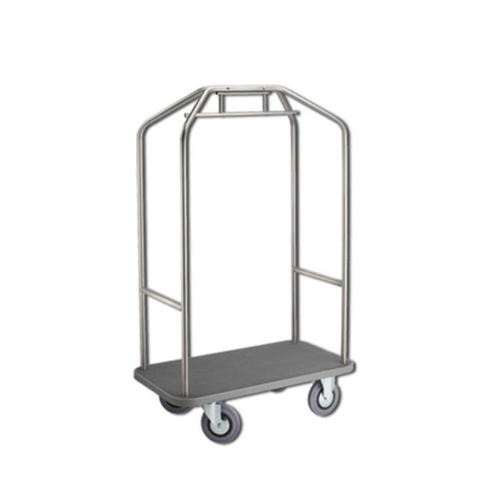 Carro maletero-perchero de acero inox 18/8. Plataforma metálica cubierta con moqueta. Barra perchera. 2 ruedas fijas y 2 giratorias de 200 mm Ø.