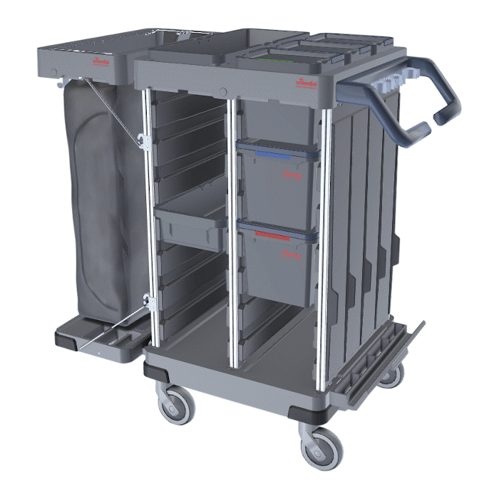 Dos sets de railes internos con altura ajustable para los contenedores, cubos y bandejas. Espacio específico para el almacenamiento de los soportes y palos (hasta 5 soportes). Dividido en tres compartimientos separados en 3 secciones (ej. productos limpios, usados y residuos). Diseñado para todos los métodos de limpieza pre-preparados. El carro cerrarse con llave mediante puertas y tapas de fácil apertura (accesorio adicional).