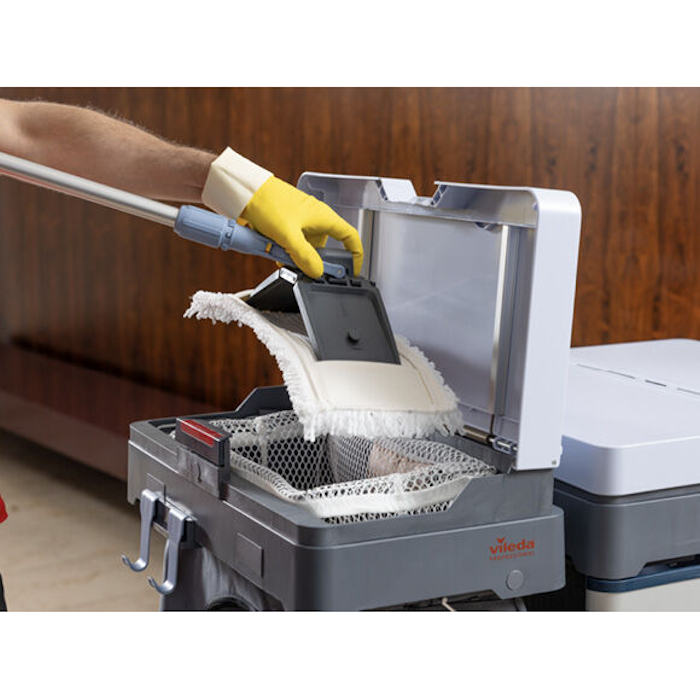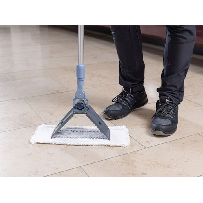 Ofrece un manejo y una maniobrabilidad excepcionales, acomodando una amplia gama de mopas de alto rendimiento. La forma en V permite que el bastidor se deslice sin esfuerzo en los bolsillos de las mopas, mientras que el mecanismo de pulsador elimina la necesidad de agacharse para enganchar o desenganchar la mopa. Sprint V mejora la velocidad de limpieza en todas las superficies y su diseño plano permite cubrir eficazmente grandes áreas, incluso en espacios con abundante mobiliario, gracias a su fácil maniobrabilidad.