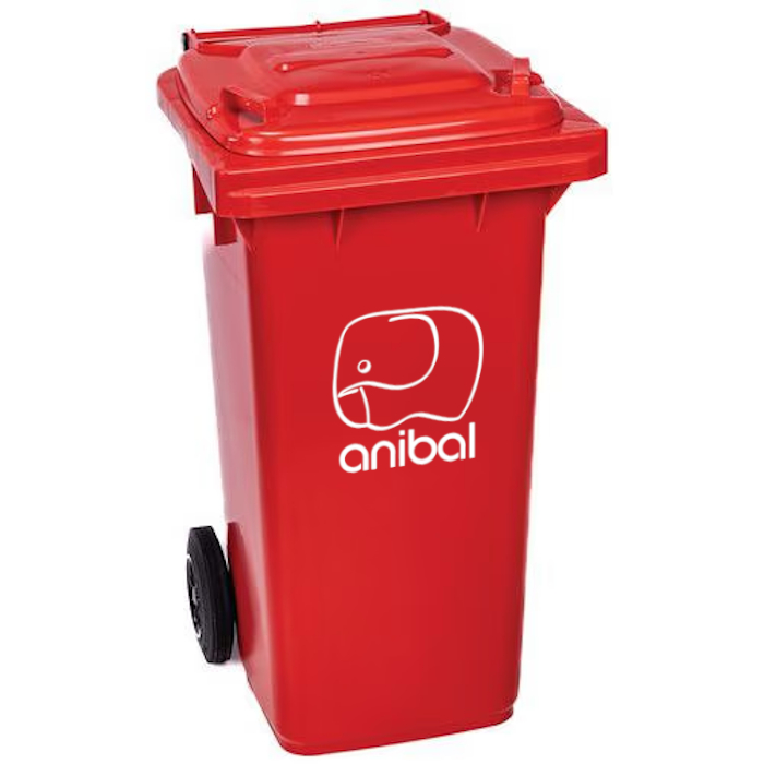 Contenedor rojo con logotipo Anibal con tapa y ruedas. Capacidad para 120 L. Carga nominal: 48 Kg.