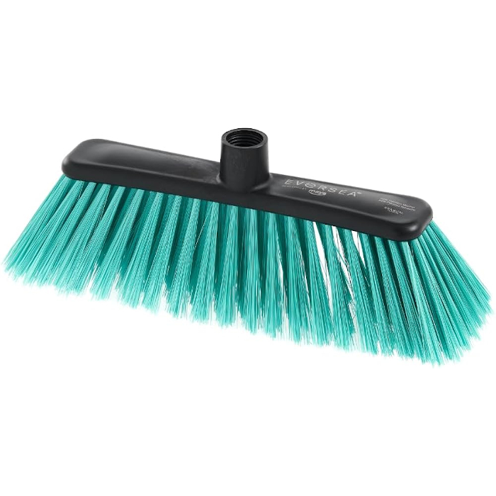 Escoba fabricada con plástico reciclado del mar. Fibra intermedia, ideal para barrido de interiores.
