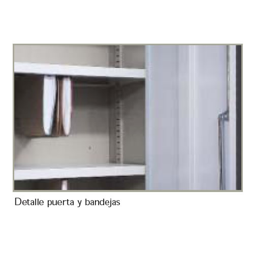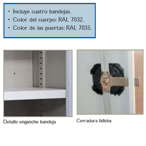Proceso de soldadura por puntos. Pintado con Epoxi-Poliéster en polvo en gris RAL 7035. Cerradura de tres puntos de cierre con dos llaves. Manecilla empotrada. Incluye 4 estantes con guías para carpetas colgantes.