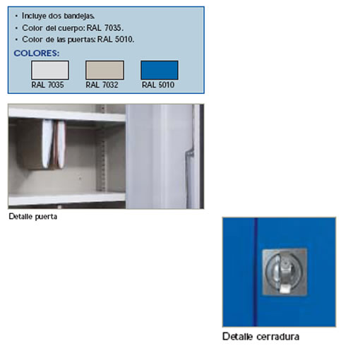Armario metálico de oficina y taller. Fabricado en chapa de acero laminado frío. Incluye 2 estantes con guías.