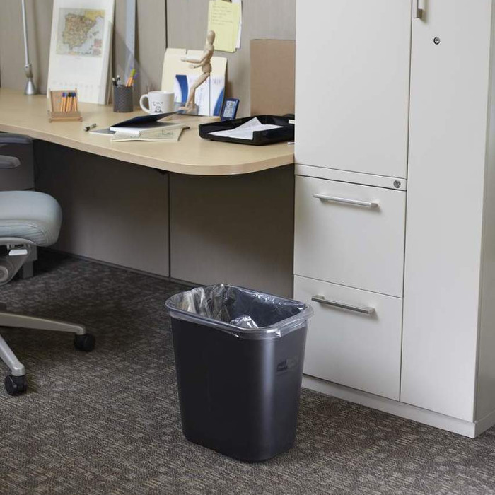Papelera de escritorio rectangular negra de 26,6 L. Bordes redondeados que lo hacen más fácil de limpiar y resistente.
