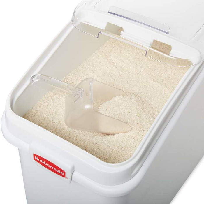 Contenedor de ingrecientes con pala con capacidad para 99 L. Con ruedas para un fácil transporte entre diferentes estancias de preparación.