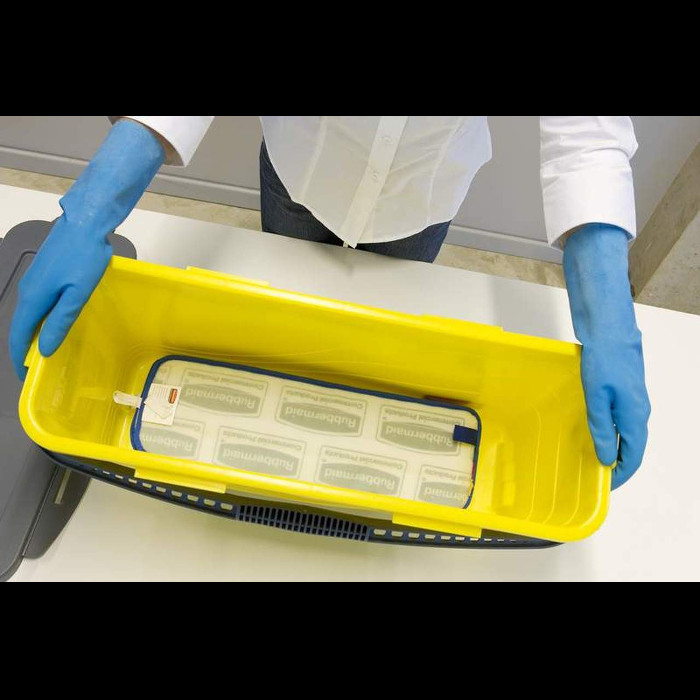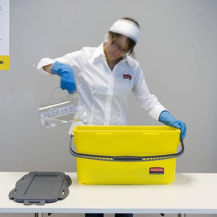 Fabricado en polipropileno. La solución limpiadora y/o desinfectante absorbida por cada mopa permite limpiar, de media y según la suciedad existente en el suelo o pared, hasta 23 m2; con el cubo completamente cargado (20 mopas), pueden limpiarse 450 m2. El diseño del cubo impide una saturación excesiva de las mopas de microfibra e incluye una guía de nivel para medir la cantidad de solución de limpieza y desinfección antes de introducir las mopas.