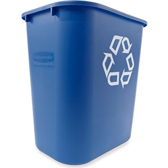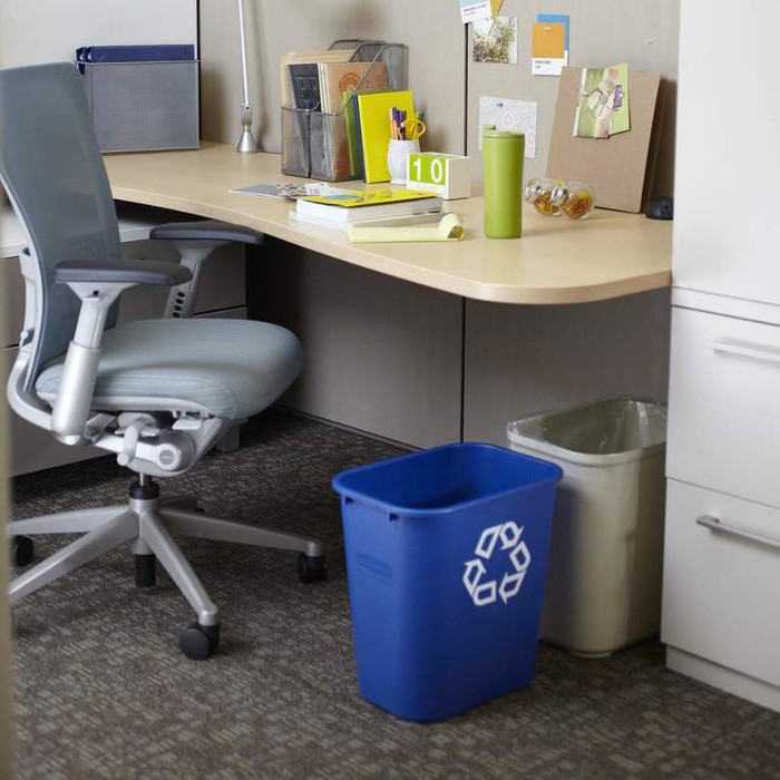 Papelera de reciclaje de escritorio, con símbolo universal de reciclaje. Bordes redondeados que lo hacen más fácil de limpiar y resistente.