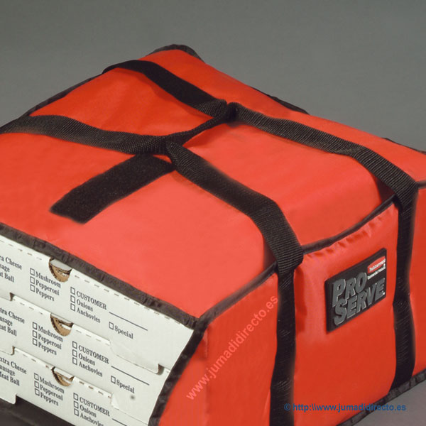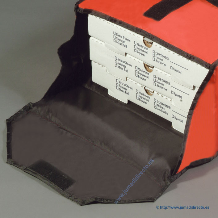 4 pizzas de Ø 30 cm o 3 de Ø 35 cm. Material: Poliéster/nailon. Para el transporte profesional de comida caliente y fría.