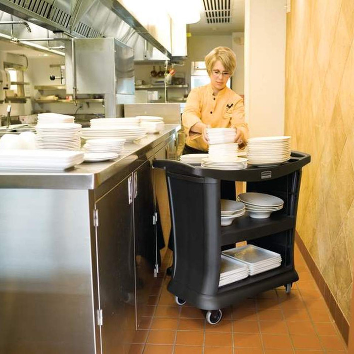 Carro de servicio negro de polipropileno de 3 estantes con capacidad total de 135 kg. Asas ergonómicas. Sólida defensa redondeada.