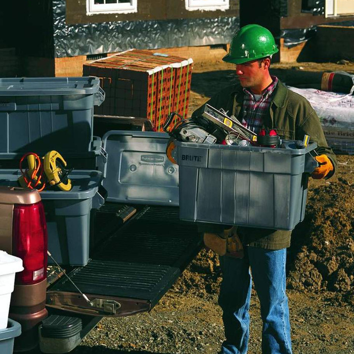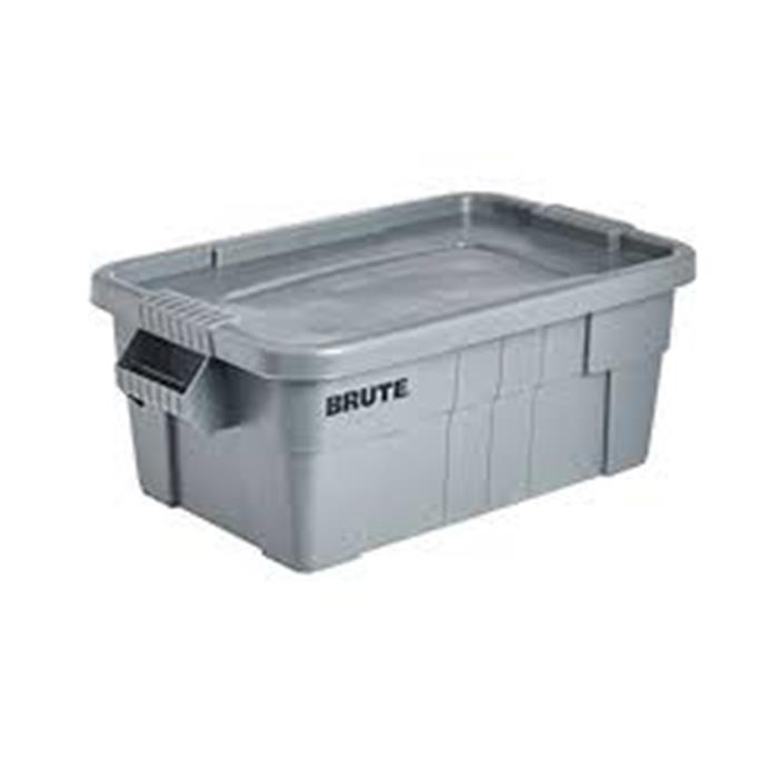 Caja de almacenamiento gris con asas y tapa con cierre a presión. Base con borde de refuerzo. Apilable. Capacidad: 53 L.