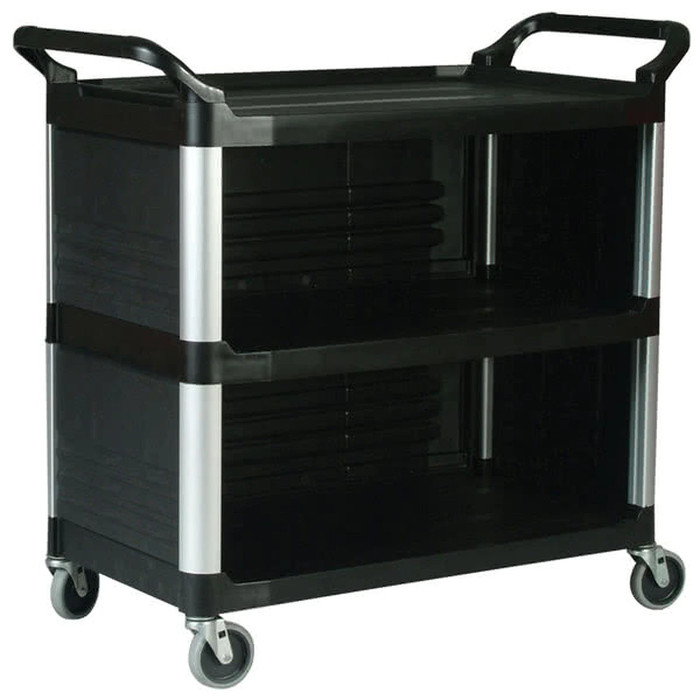 Carro de servicio negro de polipropileno de 3 estantes con capacidad total de 135 kg. Cerrado por 3 lados. Ruedas giratorias antihuella de 10,2 cm Ø.
