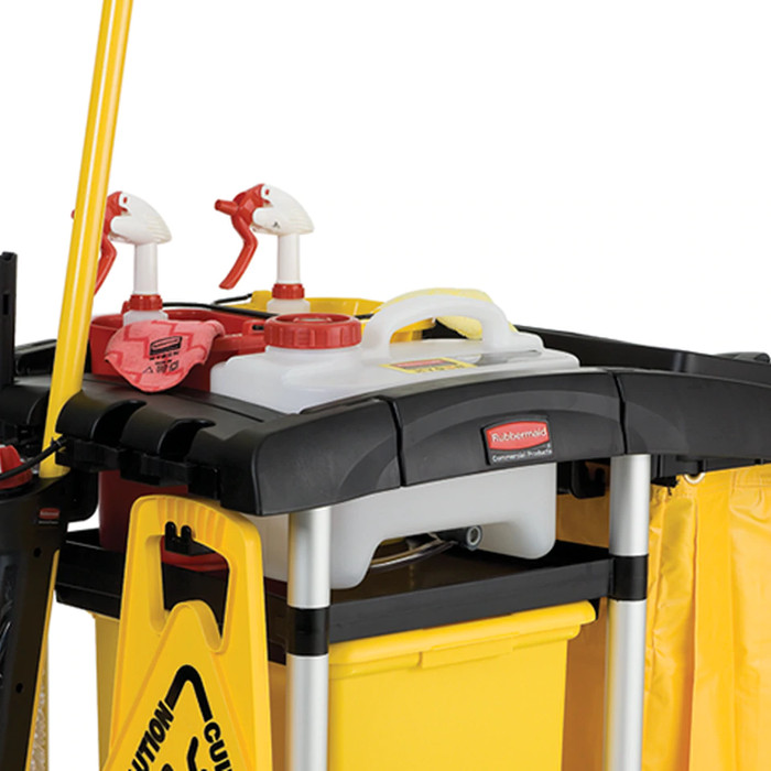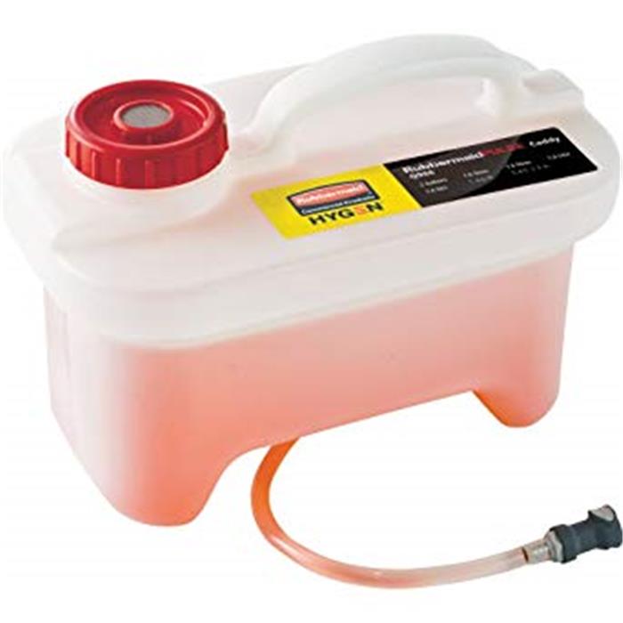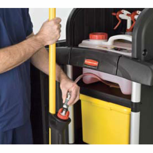Esta diseñado para transportarse de una manera segura en los carros de limpieza Rubbermaid, para poder efecturar reabastecimientos sobre la marcha.