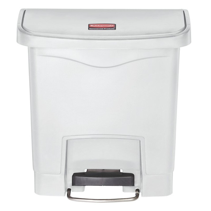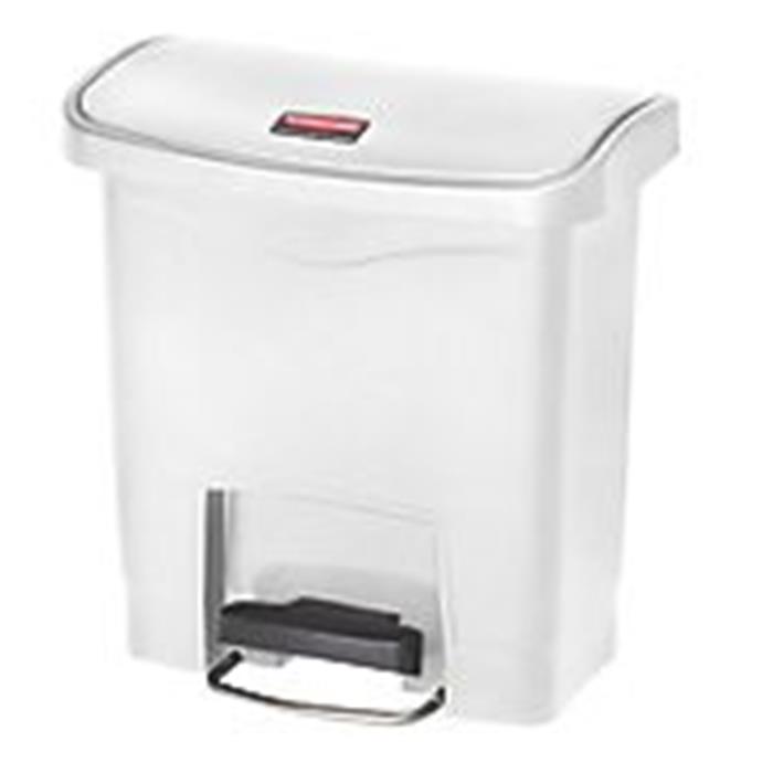 Papelera blanca de polietileno con pedal frontal de resina. Tapa silenciosa. Se adapta a los espacios más ajustados. Capacidad: 15 L.