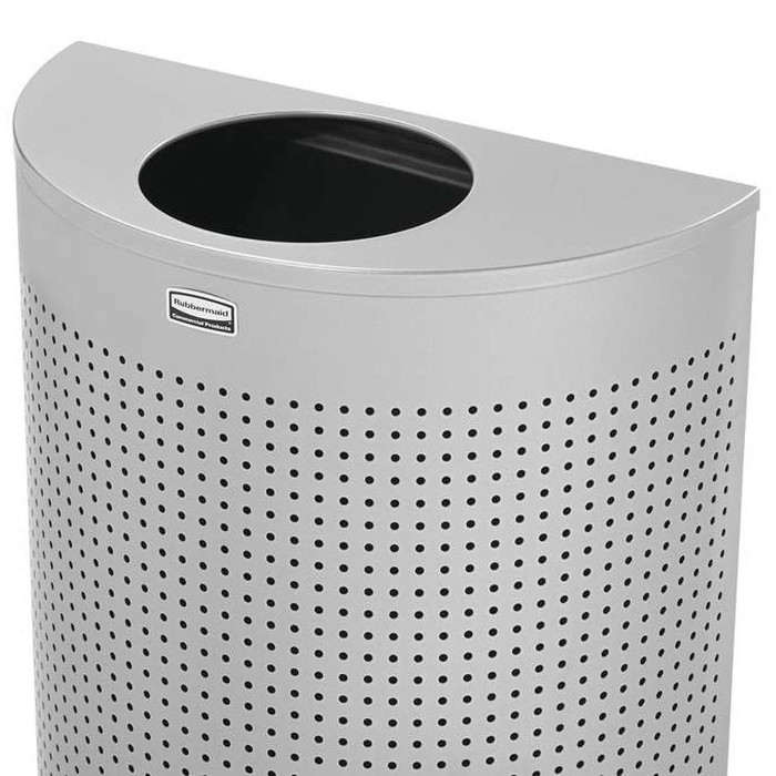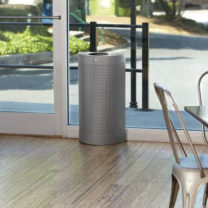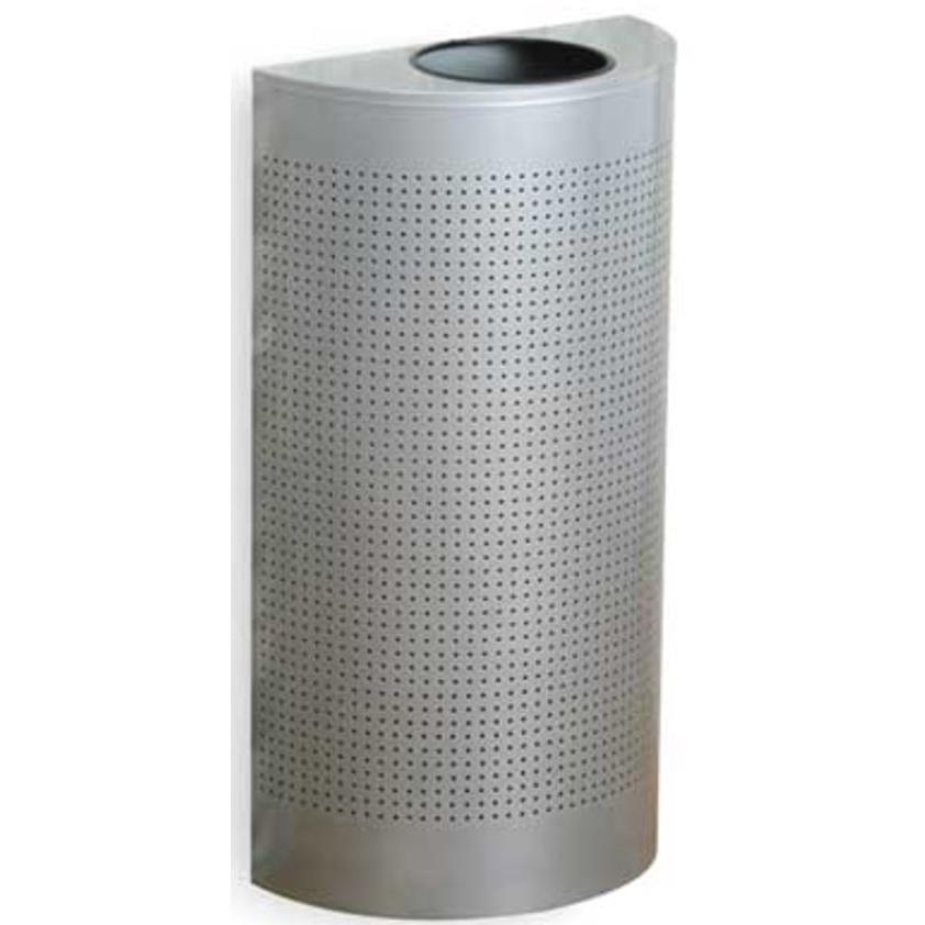 Papelera semicircular en chapa gruesa de acero ignífugo con capa pulverizada. Diseñada para minimizar las molestias en zonas transitadas.