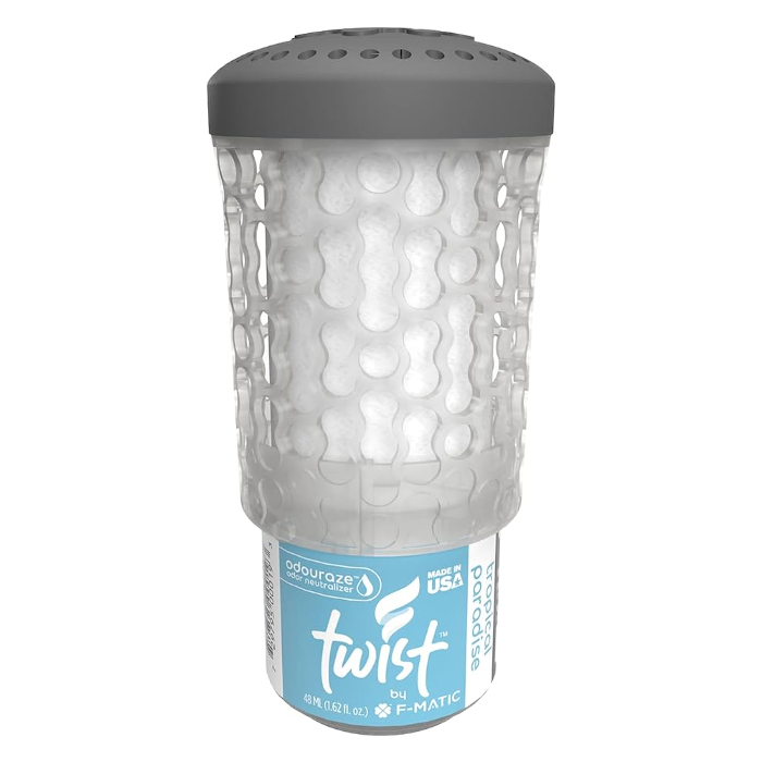 Ambientador de sobremesa antiderrames. Se activa al girar la base en el sentido de las manecillas del reloj hasta que haga clic. Se puede usar con dispensador 0508584.
