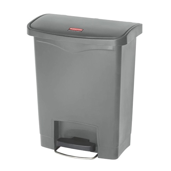 Papelera gris de polietileno con pedal frontal de resina. Tapa silenciosa. Se adapta a los espacios más ajustados. Capacidad: 30 L.