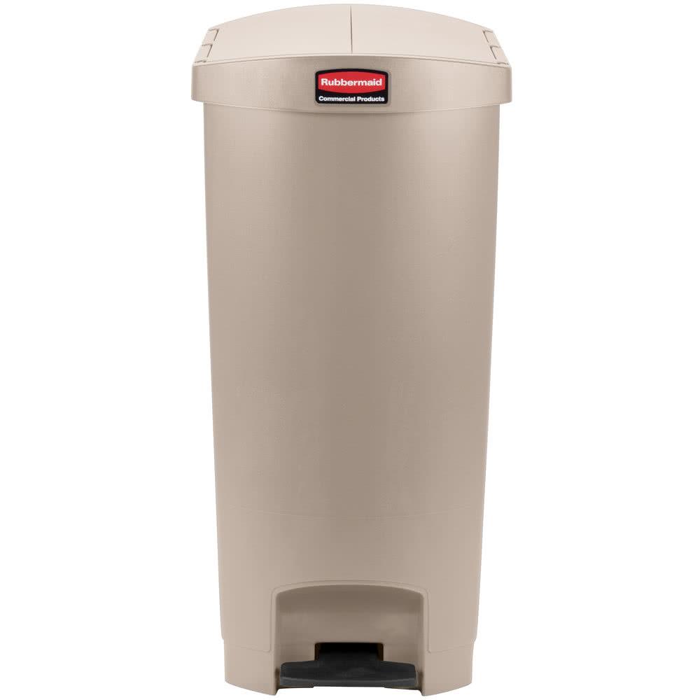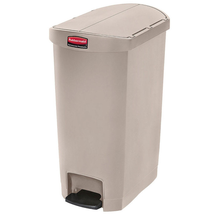 Papelera beige de polietileno con pedal lateral de resina. Tapa silenciosa. Se adapta a los espacios más ajustados. Capacidad: 68 L.