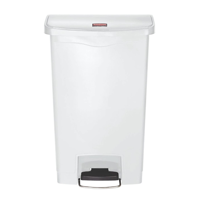 Papelera blanca de polietileno con pedal frontal de resina. Tapa silenciosa. Se adapta a los espacios más ajustados. Capacidad: 50 L.