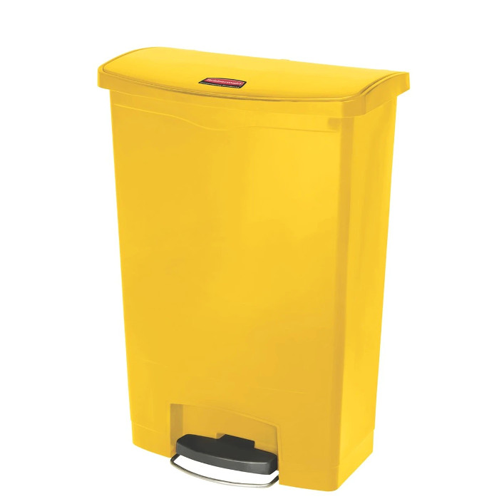 Papelera amarilla de polietileno con pedal frontal de resina. Tapa silenciosa. Se adapta a los espacios más ajustados. Capacidad: 90 L. Ruedas integradas.